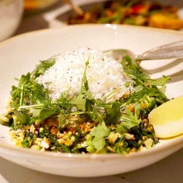 Steamed broccoli, farmer’s cheese, cardamom crumbs at abcV.