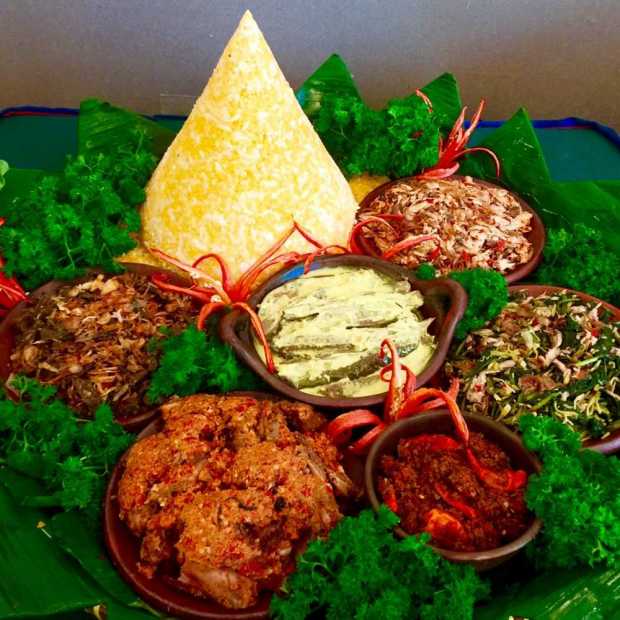 The side dishes consist of nasi jagung (cone-shaped corn rice), ikan tongkol bakar suir (shredded grilled tuna with ground chili sauce), ihu pilitode (eggplant with turmeric and coconut milk), garo (spicy chicken liver sauté with dried rice vermicelli), ayam iloni (spicy grilled chicken with 10 herbs and spices), sambal sagela (grounded fish with chili), sayur bunga papaya (spiced papaya flower). Tumpeng Bergizi Gorontalo was featured to share information that delicious traditional food is also highly nutritious.