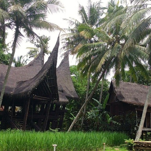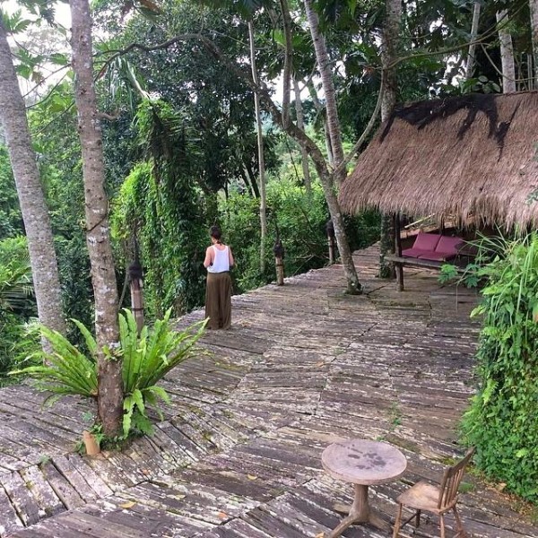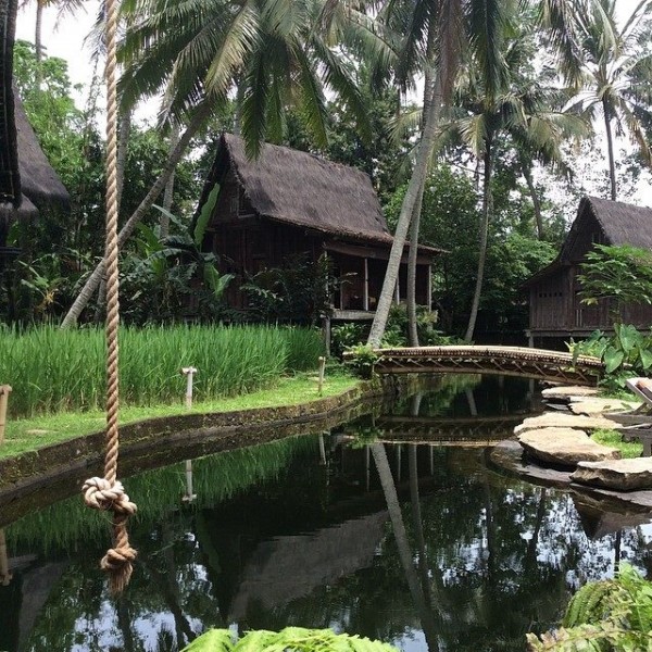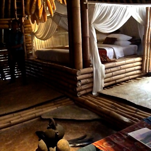 Bambu Indah's natural pool is an attraction in itself as it does not use chemicals but filters water from nearby Ayung River using lava stones. A deck shaped from the wooden base of railroad tracks and a green house made of car windshields shows creative use of recycled materials.