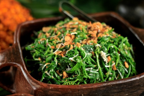 Three variations of fresh urab (vegetable dish): urab long bean, urab klungah, urab pakis